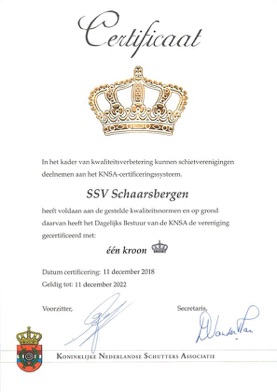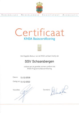 Onze vereniging is in 2009, als twaalfde schietsportvereniging in Nederland gecertificeerd door de KNSA. De certificering houdt in, dat SV Schaarsbergen op het gebied van veiligheid, verenigingsorganisatie, sportontwikkeling en trainingen een volledige ISO-certificering heeft doorstaan, inclusief afsluitende audit. In december 2018 heeft de vereniging de tweede herhalings-audit met goed gevolg doorstaan; de vereniging is tot december 2022 gecertificeerd met 1 kroon.